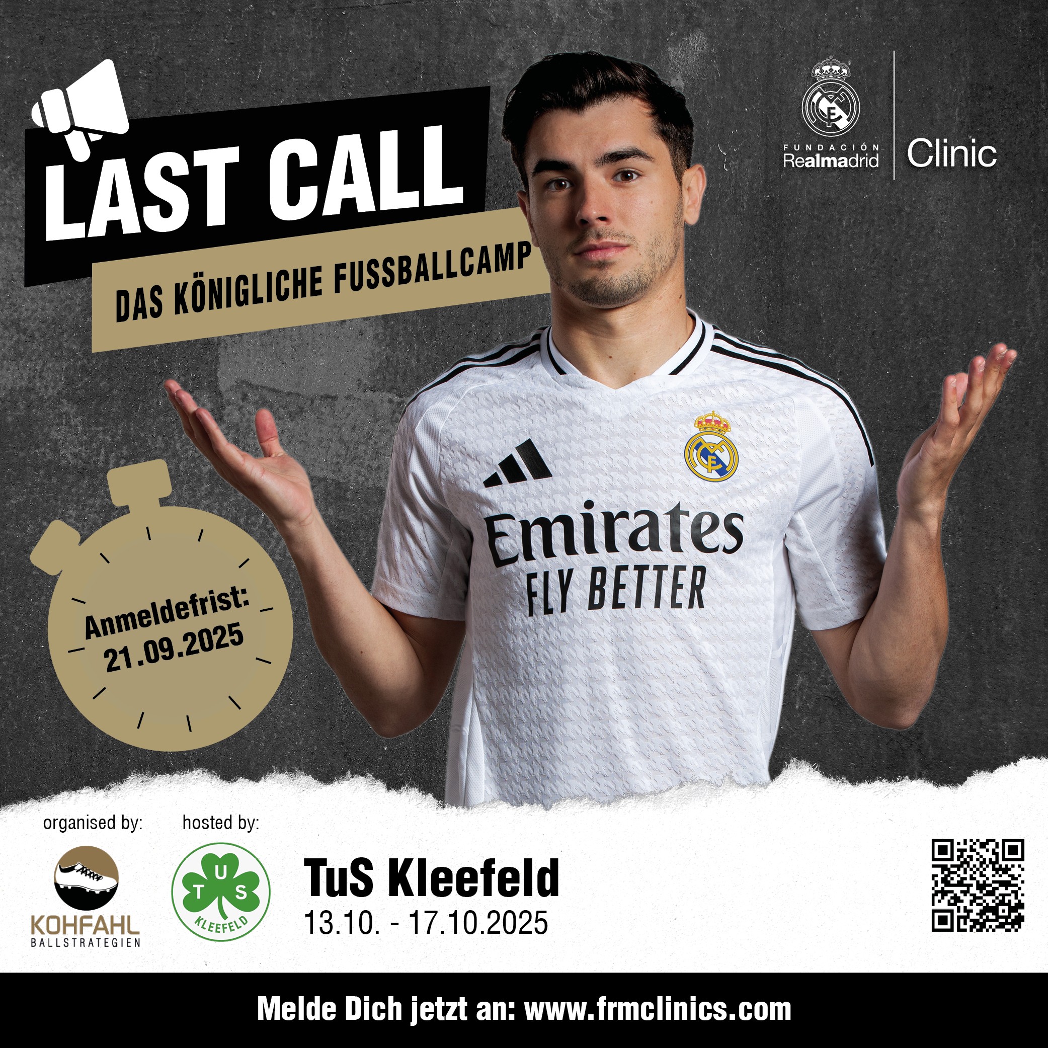 Sichere Dir jetzt noch schnell Deine Teilnahme an unserem königlichen Fußballcamp, bevor es zu spät ist. Die Fundación Real Madrid Clinic organisiert von Kohfahl Ballstrategien ist vom 13.10.25 - 17.10.25. zu Gast beim TuS Kleefeld. Top-Coaches trainieren Dich nach der Fundación Real Madrid Methodik und unterstützen Dich bei Deiner Entwicklung – fußballerisch und charakterlich. Das solltest Du nicht verpassen!