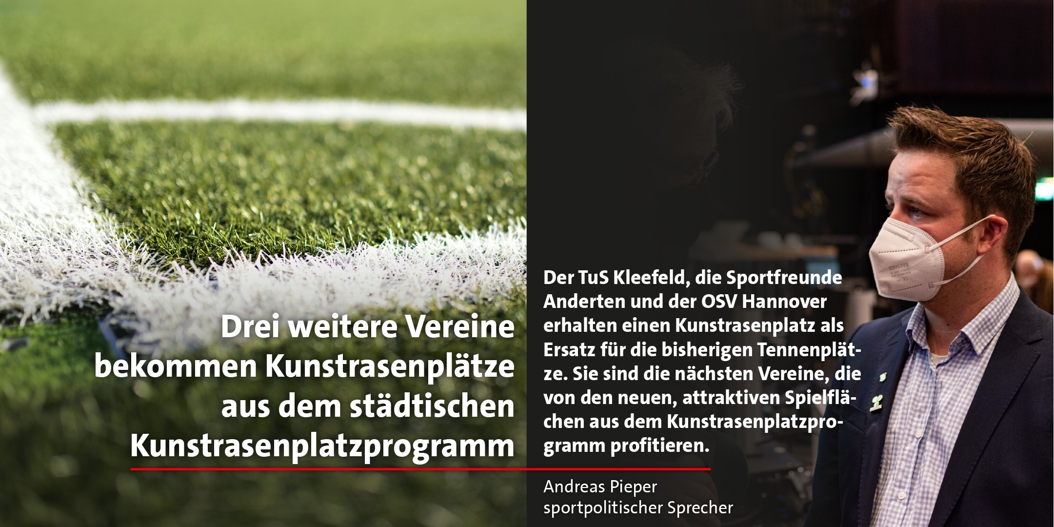 Der TuS Kleefeld gemeinsam mit der SG Blaues Wunder e.V., die Sportfreunde Anderten und und der OSV Hannover erhalten jeweils einen neuen Kunstrasenplatz als Ersatz für die vorhandenen Tennenplätze. Sie sind die nächsten Vereine, die von den neuen, attraktiven Spielflächen aus dem Kunstrasenplatzprogramm profitieren.", so Andreas Pieper, sportpolitischer Sprecher der SPD Ratsfraktion Hannover.